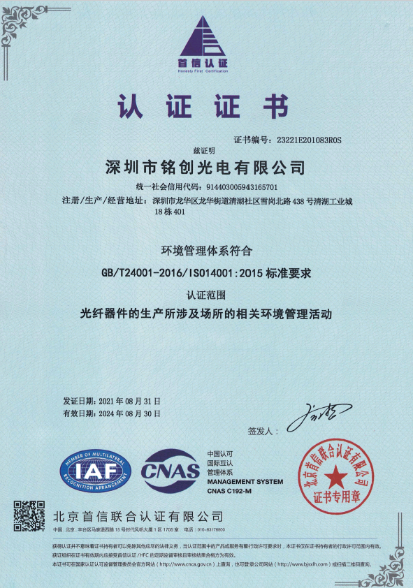 深圳市銘創(chuàng)光電有限公司于2012年成立,公司總部位于深圳市光明區(qū),是一家國家級高新技術(shù)企業(yè),通過了IS09001-2015質(zhì)量管理體系認證和IS014001-2015環(huán)境管理體系認證;經(jīng)過多年的持續(xù)研發(fā)投入和專注發(fā)展,銘創(chuàng)光電已逐漸成為光纖激光器、光纖傳感、激光雷達和激光通信等領(lǐng)域的綜合性產(chǎn)品服務(wù)商。 公司目前設(shè)立有光無源器件研發(fā)生產(chǎn)中心和激光研發(fā)生產(chǎn)中心。無源器件研發(fā)生產(chǎn)中心設(shè)有有高標準的無塵車間,可提供各種波長的無源光纖器件、高功率光纖器件、保偏光纖產(chǎn)品、超小型光纖器件。激光研發(fā)中心建立在安徽合肥市,研發(fā)生產(chǎn)特殊波長的激光光源、光纖激光器、光纖放大器以及新產(chǎn)品的技術(shù)研究儲備。研發(fā)生產(chǎn)中心與多地科研單位合作,能夠迅捷高效的為客戶提供相